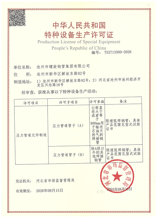 滄州市螺旋鋼管集團有限公司位于滄州市新華區解放東路92號,是2000年由滄州市螺旋鋼管廠(成立于1994年)改制而成立的股份制有限公司,大型二檔企業、河北省重點冶金企業。公司占地30萬平方米,總資產5.3億元,現在職工840人,其中有各類職稱的占10%,年產螺旋鋼管30萬噸,產值15億元。